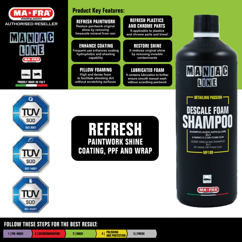 Descale Foam Shampoo Maniac Line is a 2-in-1 descaling acid shampoo, designed to eliminate limescale contamination that dulls the bodywork.