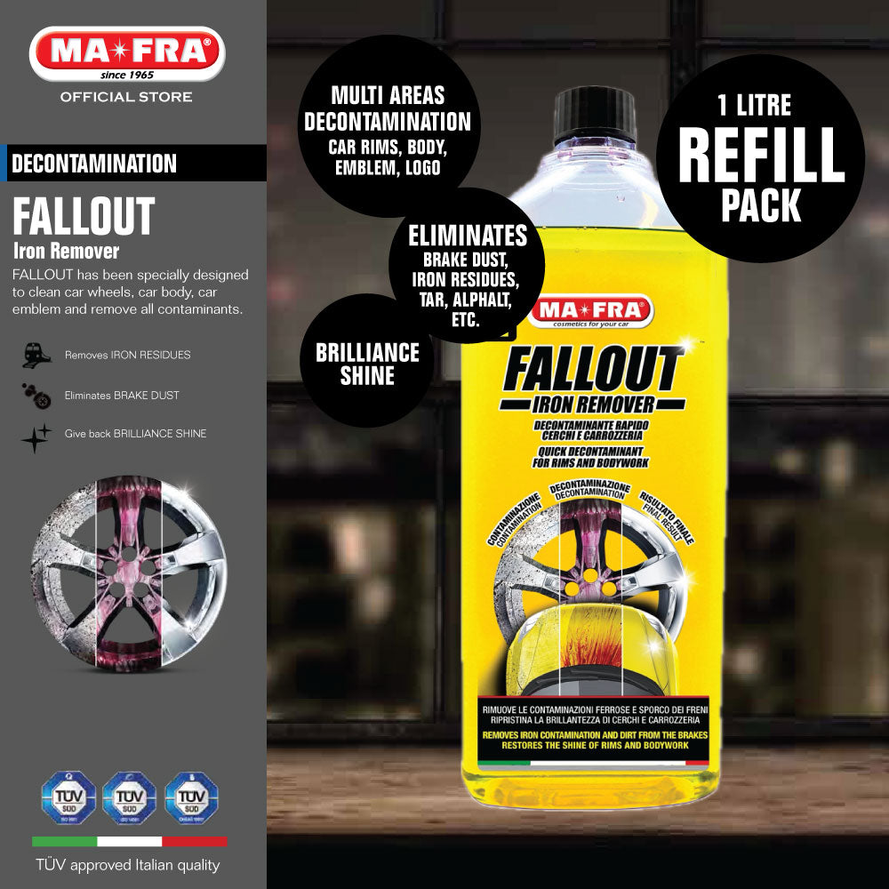 Fallout Iron Remover 500ml has been specially developed to eliminate what classic rim cleaners cannot eliminate. The product is highly effective and acid-free and is ideal for all steel rims , alloy and also on chrome rims and polished . Thanks to its innovative formula, it chemically converts and dissolves ferrous residues that have penetrated into the paint, creating a purplish solution that can be easily rinsed in complete safety.