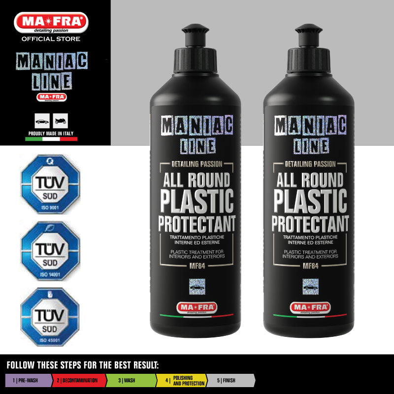 All Round Plastic Protectant from Mafra 's Maniac Line is a water-based, pH-neutral treatment for interior and exterior car plastics .