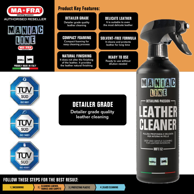 - Leather Cleaner is the perfect choice for those who want to enhance the aesthetics of car interiors without compromise. Meticulously designed by Maniac Line, it is the ultimate tool for leather care: powerful, safe, easy to use.